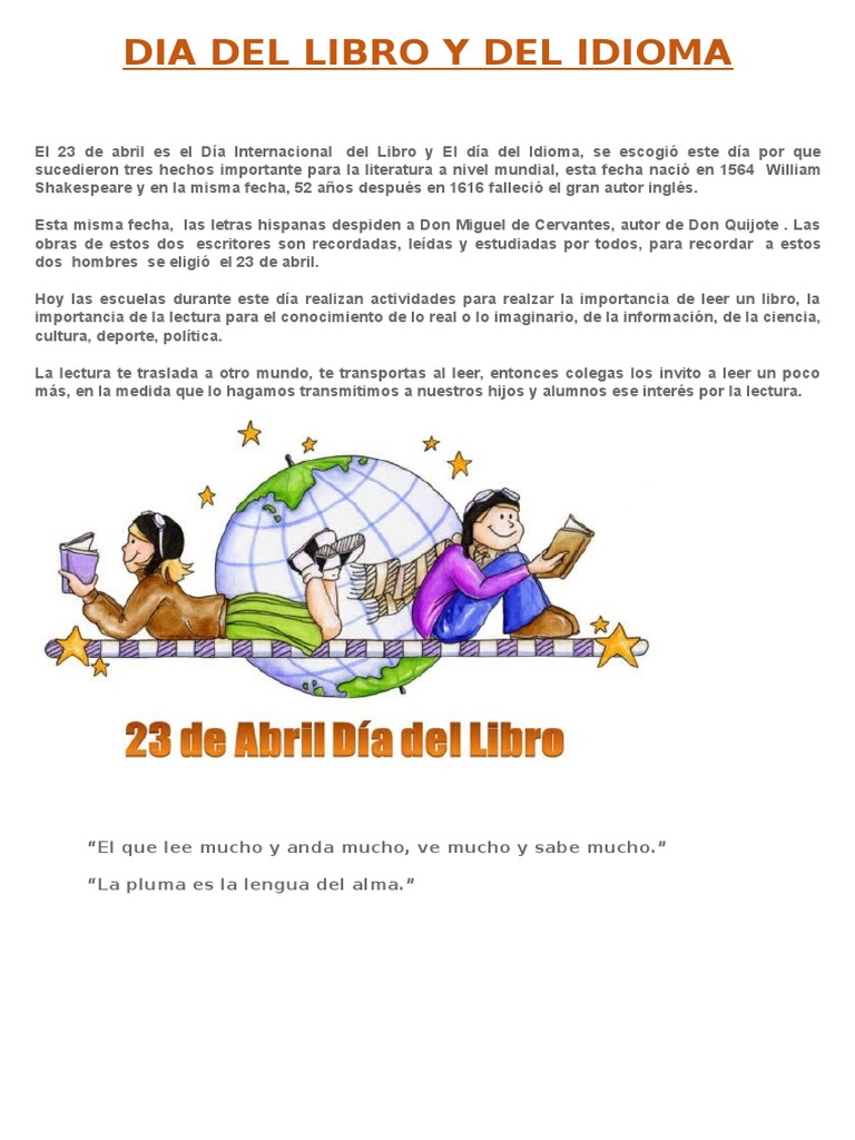 Dia Del Libro Y Del Idioma - Dia Del Libro Y Del Idioma : Se acerca el 23 de abril y buscando en la web he encontrado en unos de mis portales favoritos un compedio de textos ideales para conmemorar este día.. Lea aquí todas las noticias sobre día del idioma: El día del libro es un motivo para celebrar la importancia de la lectura, fomentar el crecimiento de los niños y niñas como lectores y promover el amor a la la unesco difundirá citas, poemas y mensajes para simbolizar el poder de los libros y fomentar la lectura. Mensaje de la escuela juan antonio román valecillos en san cristóbal estado táchira, para el dia del libro y el idioma. Día internacional del libro es una conmemoración celebrada a nivel internacional con el objetivo de fomentar la lectura. Hace años, este día no se celebraba.